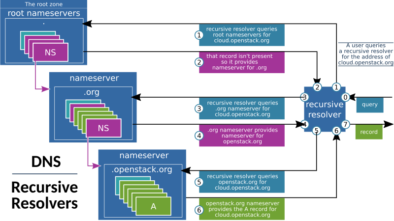 For example in the diagram below, when searching for cloud.openstack.org, it will start with the root nameserver “.”, which will reply with the location of the “.org” nameserver. The resolver can then contact the “.org” nameserver to get the “openstack.org” nameserver and from there finally get the “cloud.openstack.org” record and return it to the user.