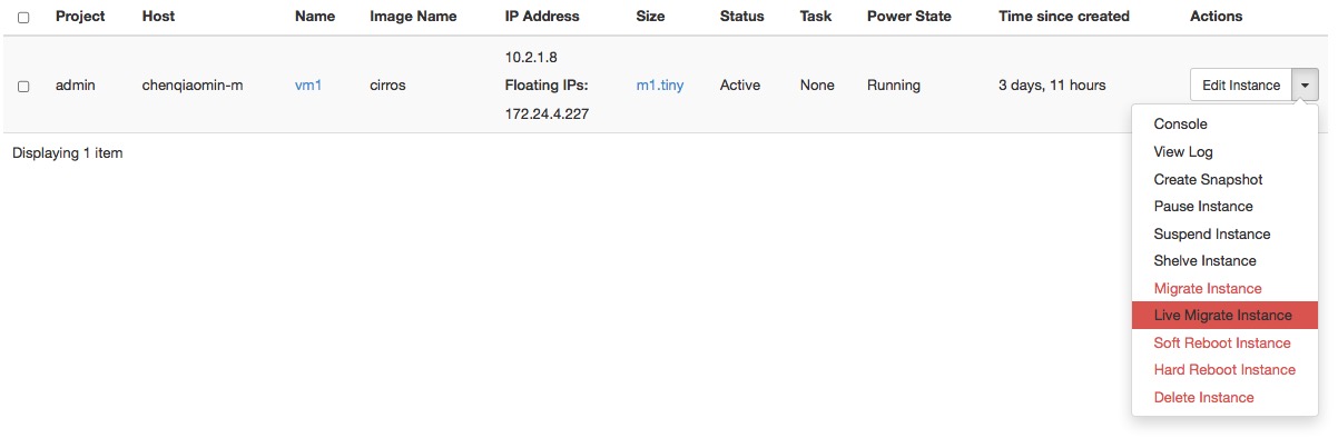 Sebagai pengguna administratif, Anda dapat mengelola instance untuk pengguna di berbagai proyek. Anda dapat melihat, menghentikan, mengedit, melakukan reboot lunak atau keras, membuat cuplikan dari, dan memigrasi instance. Anda juga dapat melihat log untuk instance atau meluncurkan konsol VNC untuk suatu instance.