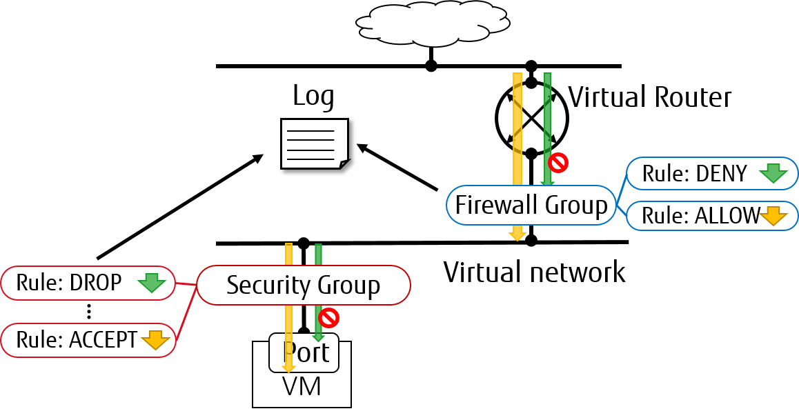 • Log every DROP event: Every DROP security events will be generated when an incoming or outgoing session is blocked by the security groups or firewall groups