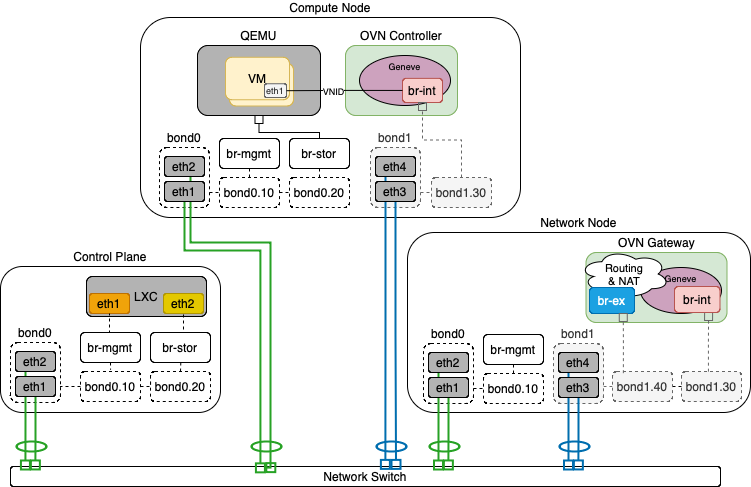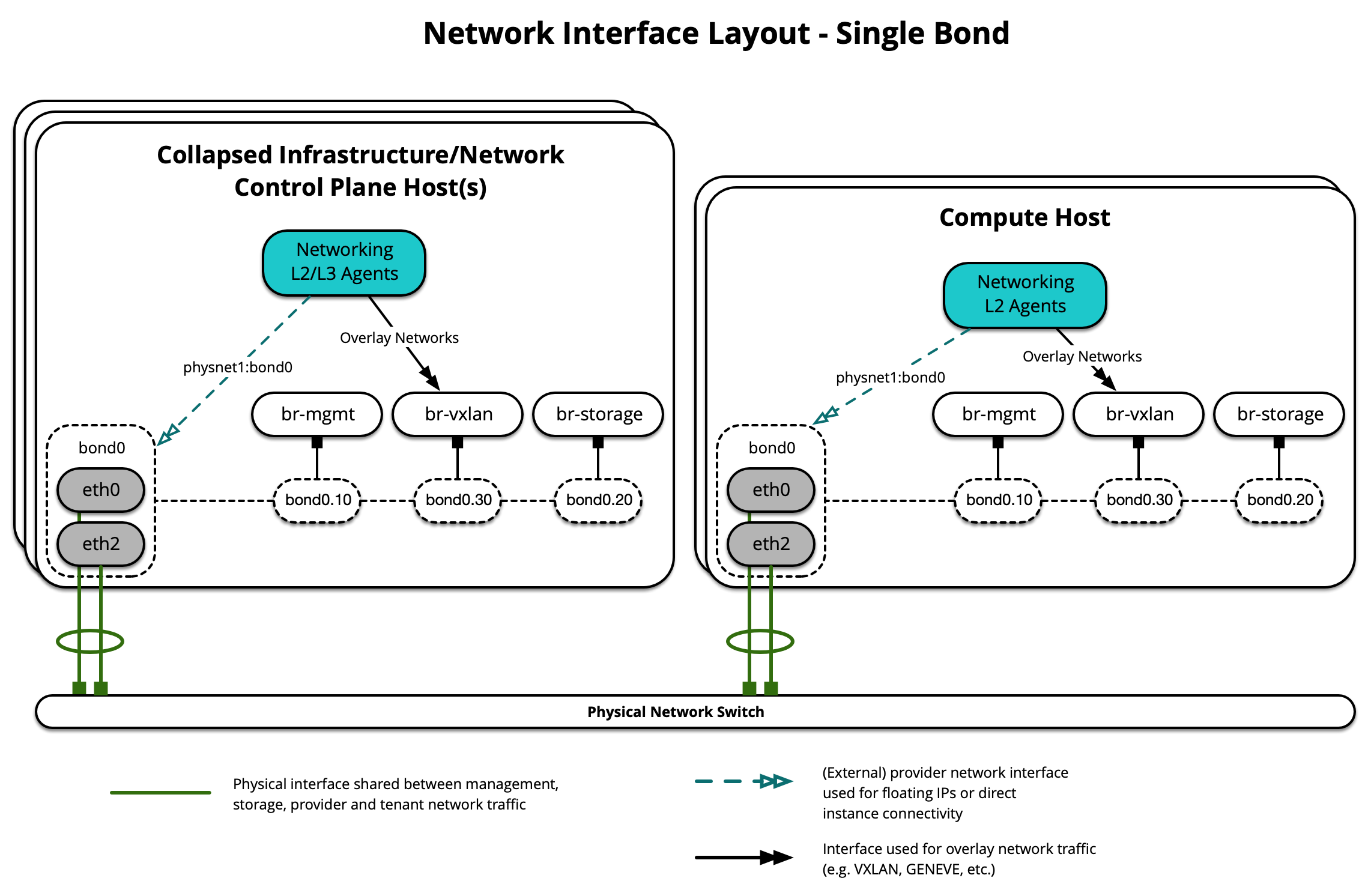 OpenStack-Ansible mendukung penggunaan beberapa antarmuka atau set antarmuka terikat yang membawa lalu lintas untuk layanan dan instance OpenStack.