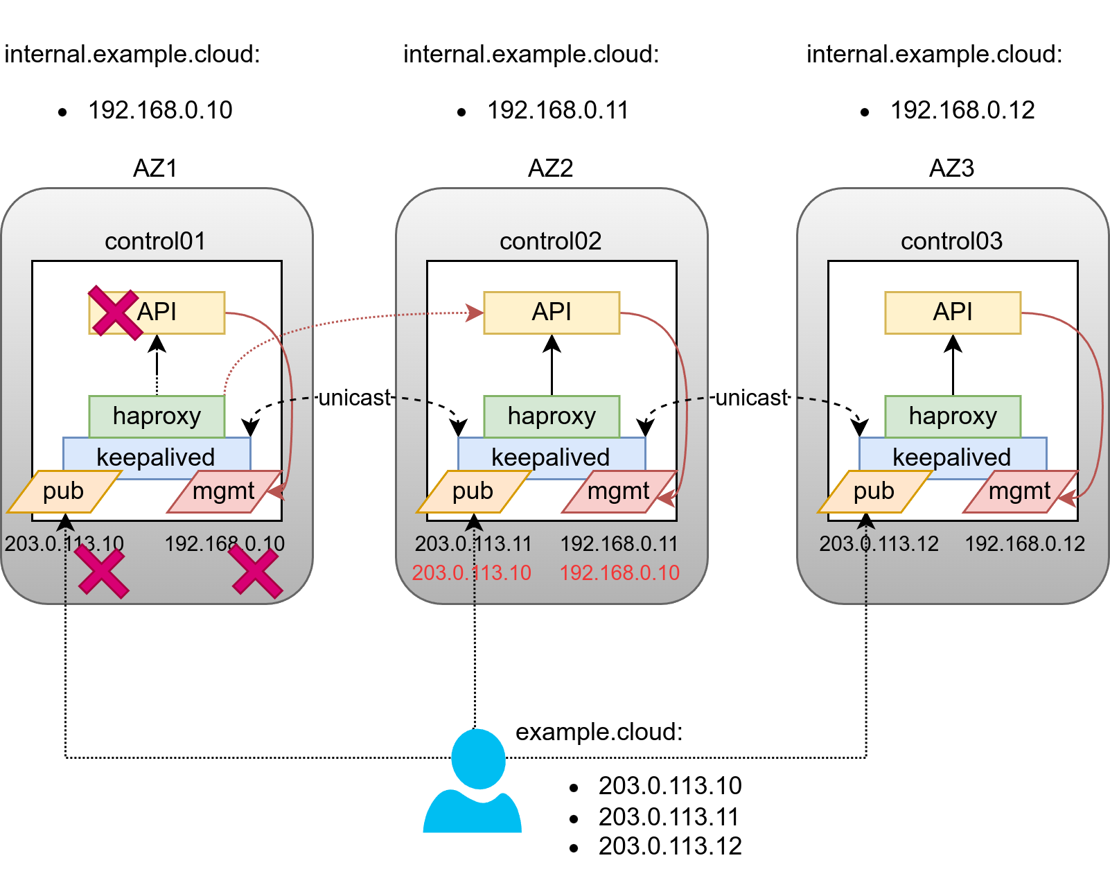 Балансировщик нагрузки (HAProxy) обычно развертывается на хостах инфраструктуры. Поскольку хосты инфраструктуры распределены по зонам доступности, нам необходимо разработать более сложную конструкцию, направленную на решение следующих проблем: