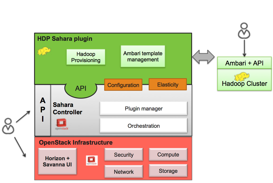 The Hortonworks Data Platform (HDP) sahara plugin provides a way to provision HDP clusters on OpenStack using templates in a single click and in an easily repeatable fashion. As seen from the architecture diagram below, the sahara controller serves as the glue between Hadoop and OpenStack. The HDP plugin mediates between the sahara controller and Apache Ambari in order to deploy and configure Hadoop on OpenStack. Core to the HDP Plugin is Apache Ambari which is used as the orchestrator for deploying HDP on OpenStack.
