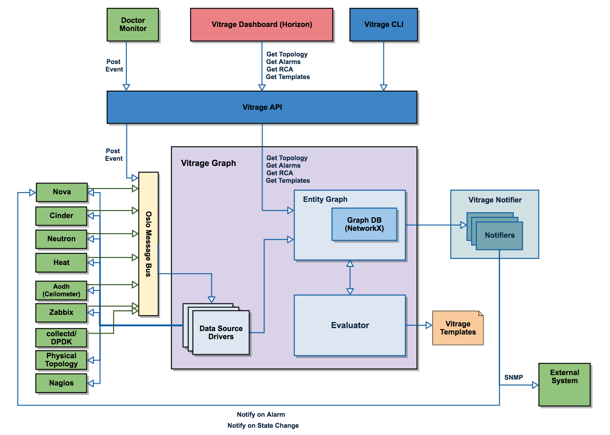 Vitrage Data Sources are responsible for importing information from different sources, regarding the state of the system. This includes information regarding resources (physical, virtual, and applications) and alarms. The information is then processed into the Vitrage Graph. Currently Vitrage supports OpenStack datasources like Nova, Cinder, Neutron, Heat and Aodh, as well as external monitors like Nagios, Zabbix and collectd.