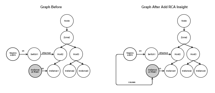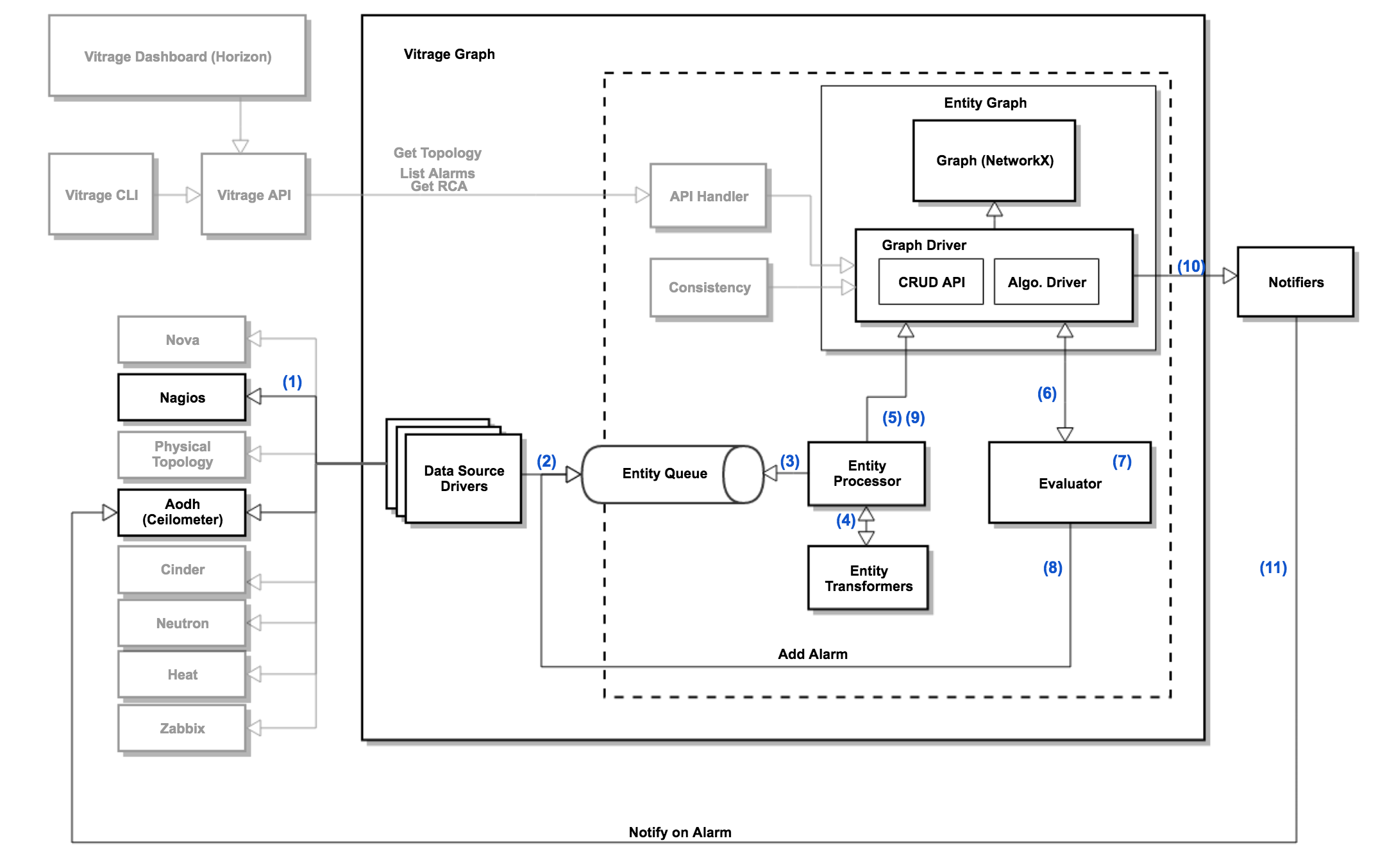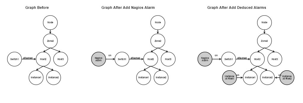 - (steps 1-4) Nagios datasource driver pushes a nagios alarm on a switch to the Entity Queue, which is converted by Nagios Transformer to a vertex and inserted to the Graph