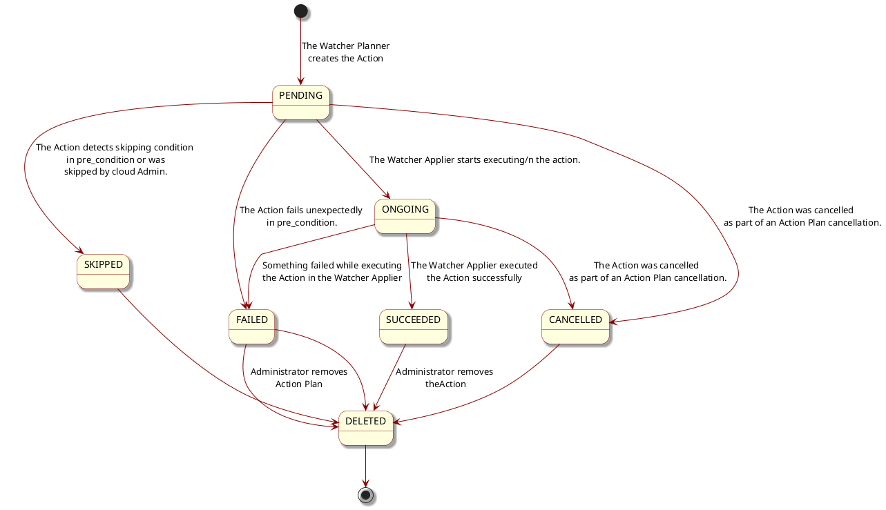 DELETED : the Action is still stored in the Watcher database but is not returned any more through the Watcher APIs.