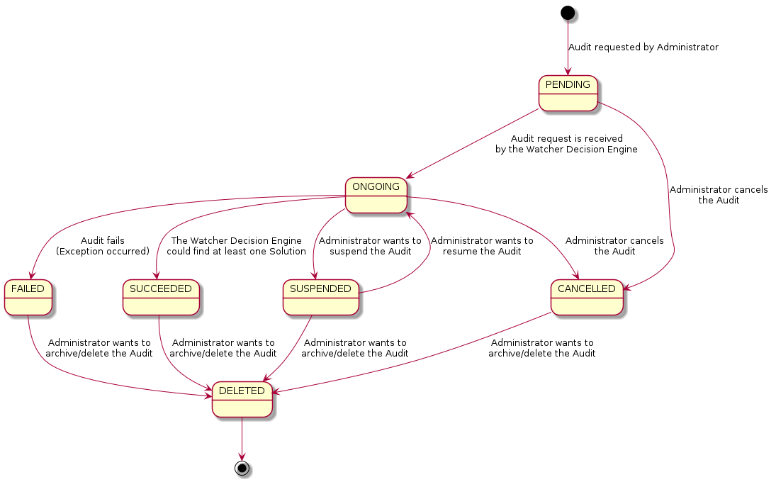 PENDING : a request for an Audit has been submitted (either manually by the Administrator or automatically via some event handling mechanism) and is in the queue for being processed by the Watcher Decision Engine