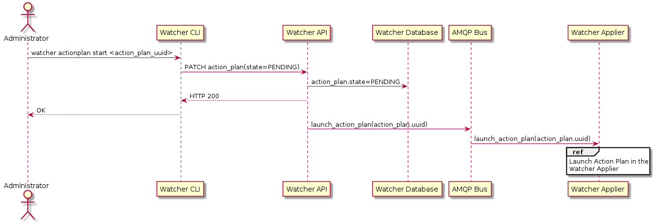 A message is sent on the AMQP bus which triggers the Action Plan in the Watcher Applier: