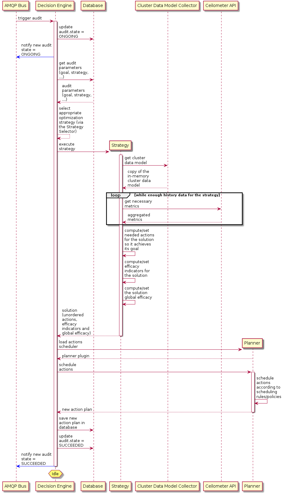 A message is sent on the AMQP bus which triggers the Audit in the Watcher Decision Engine: